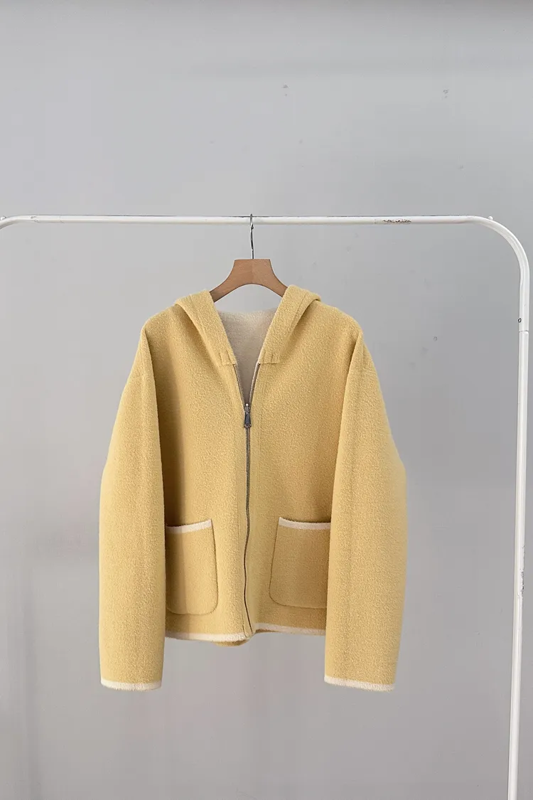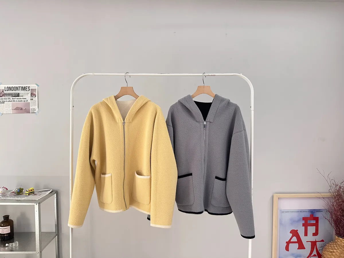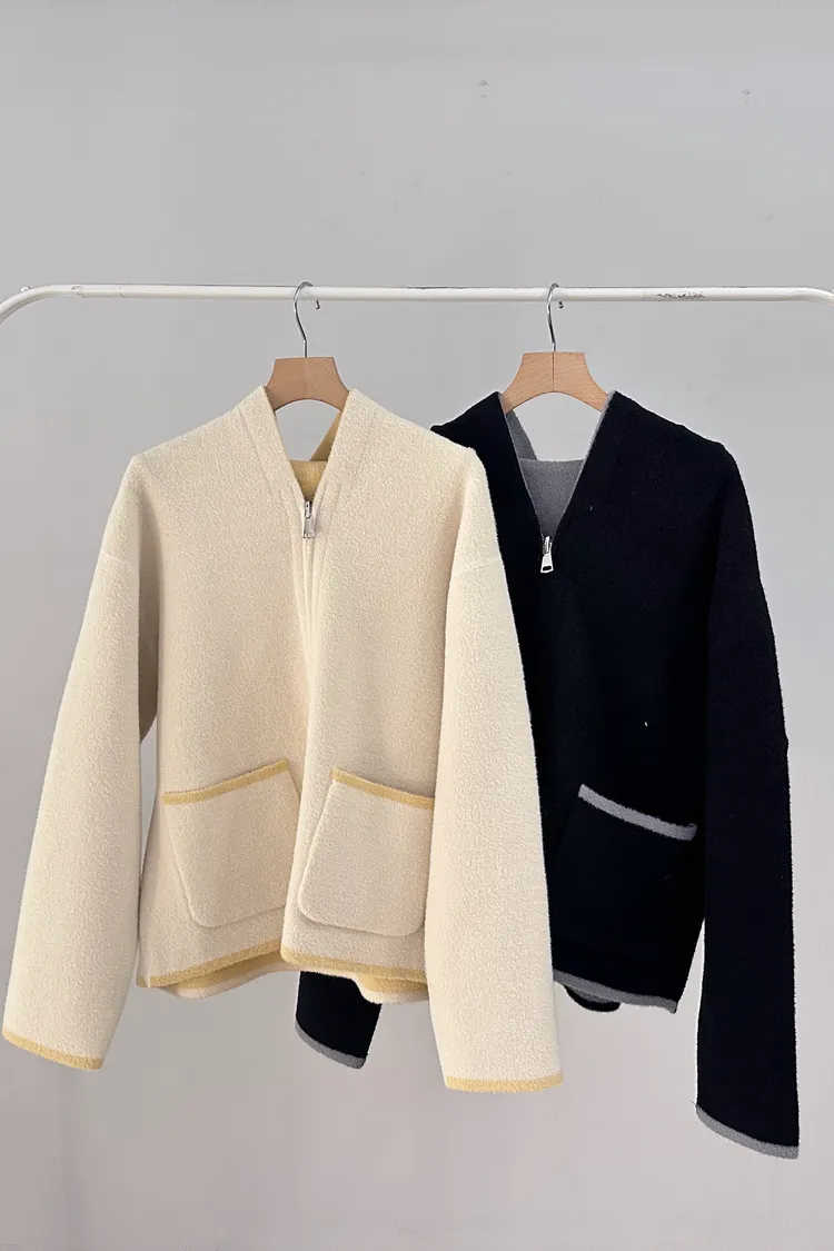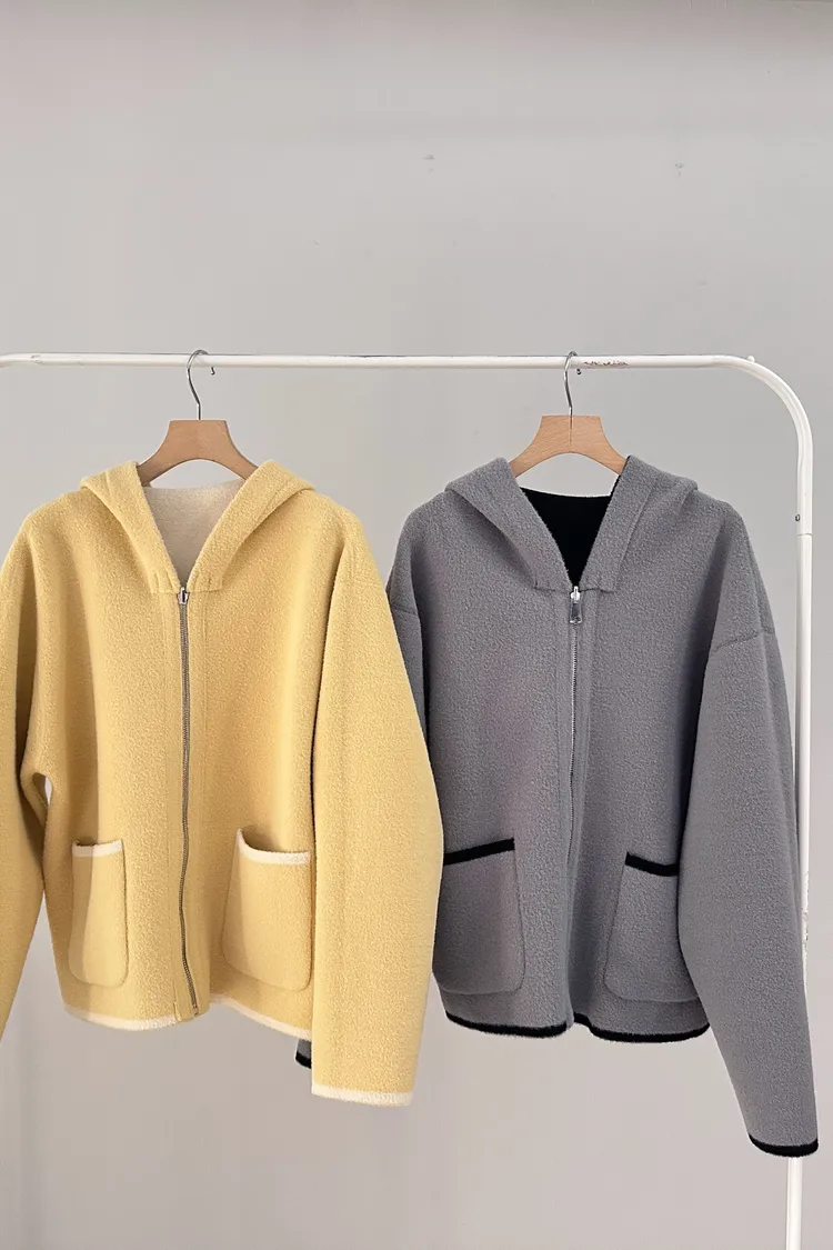 這件主打就是兩面穿,一件就有兩種不同風格,而且兩面都有可愛的滾邊+口袋細節,一面偏連帽休閒、一面偏V領、小香感。