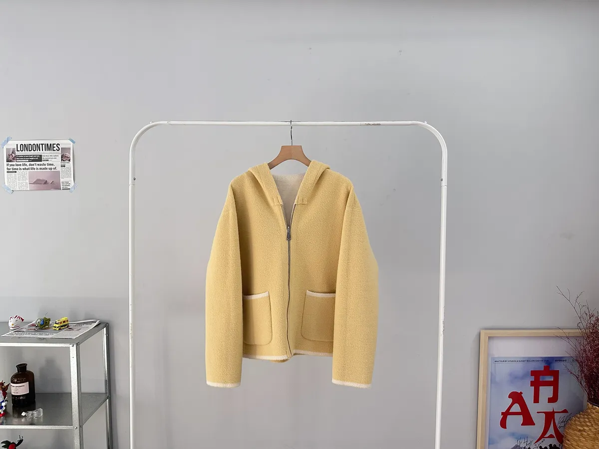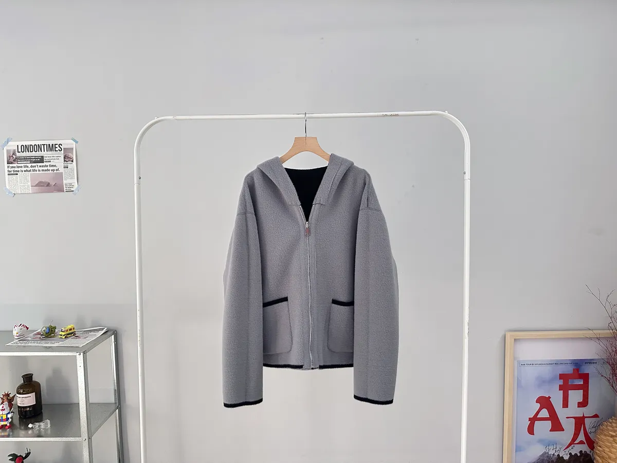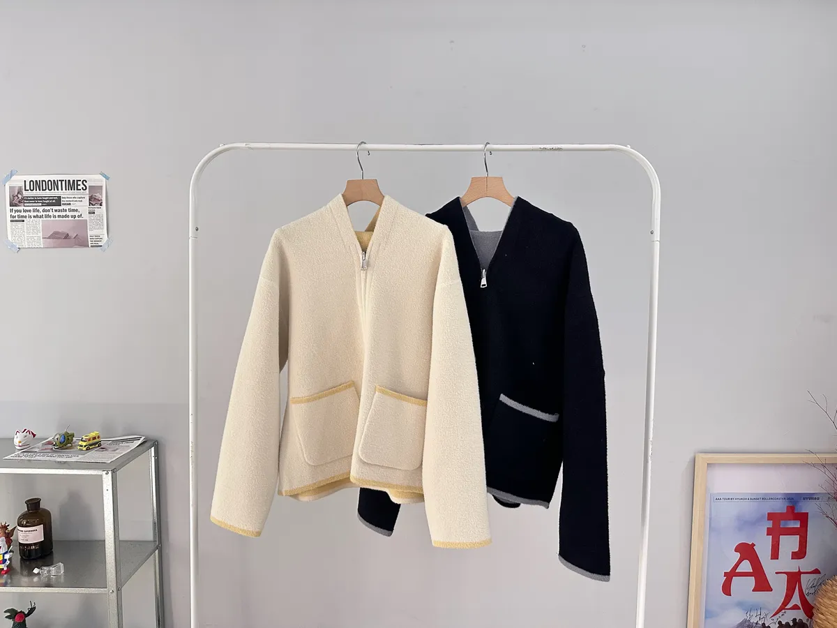 這件主打就是兩面穿,一件就有兩種不同風格,而且兩面都有可愛的滾邊+口袋細節,一面偏連帽休閒、一面偏V領、小香感。